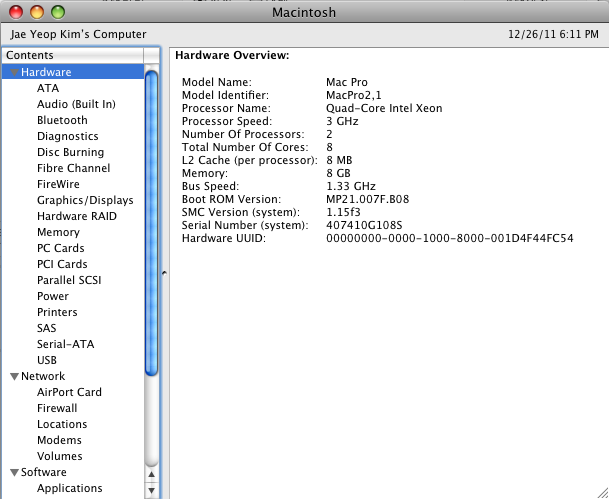 Mac Pro 2,1 (Spec : http://www.everymac.com/systems/apple/mac_pro/stats/mac-pro-eight-core-3.0-specs.html)